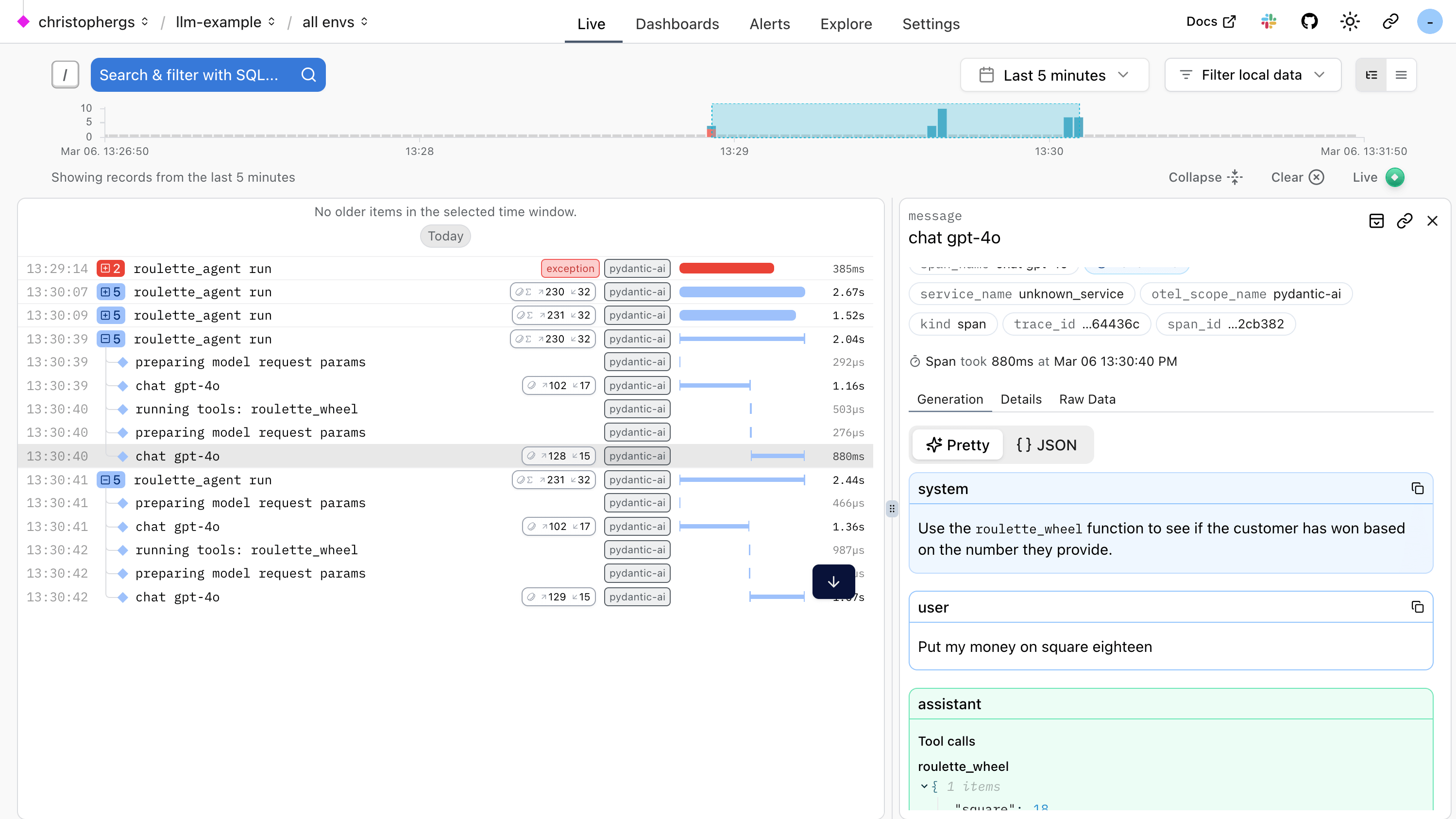 For more information, see the logfire.instrument_pydantic_ai() reference or the Pydantic AI docs on instrumenting with Logfire.